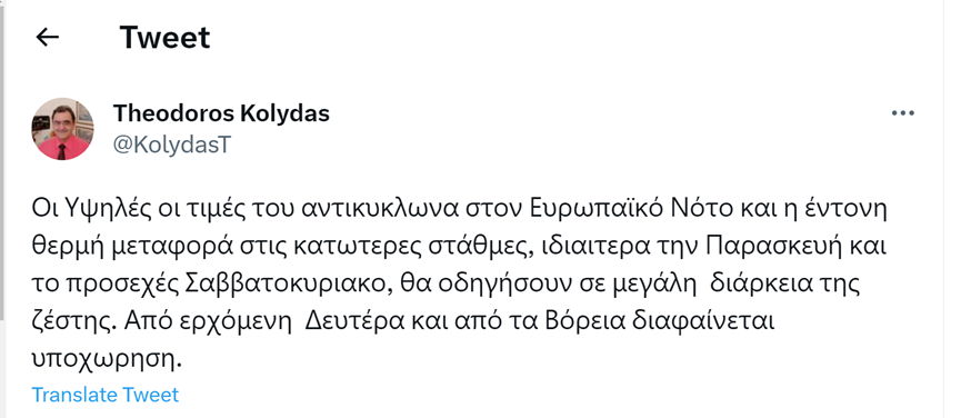 Στη συνέχεια, ο Θοδωρής Κολυδάς ανέφερε το πότε θα αρχίσει να υποχωρεί η ζέστη, γράφοντας ότι «από ερχόμενη Δευτέρα και από τα Βόρεια διαφαίνεται υποχώρηση».