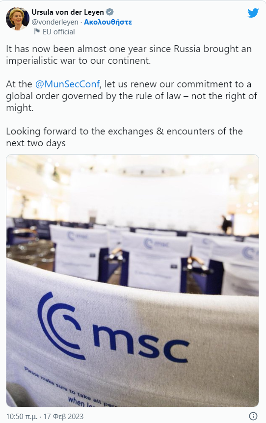 «Έχει περάσει σχεδόν ένας χρόνος από τότε που η Ρωσία έφερε έναν ιμπεριαλιστικό πόλεμο στην ήπειρό μας. Στο @MunSecConf (Στη Διάσκεψη του Μονάχου για την Ασφάλεια), ας ανανεώσουμε τη δέσμευσή μας για μια παγκόσμια τάξη πραγμάτων που θα διέπεται από το κράτος δικαίου κι όχι το δικαίωμα της ισχύος».