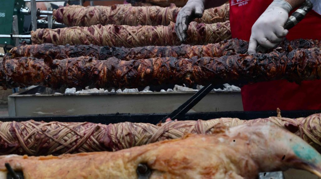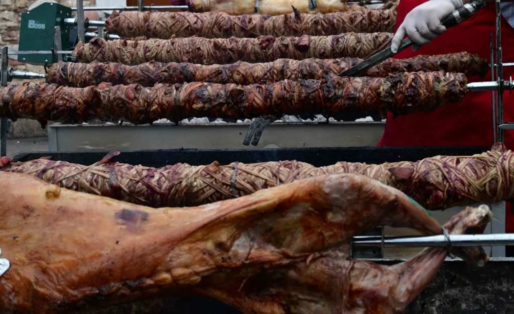Οι τουρίστες, απαθανατίζουν τις εικόνες των σούβλων και των ψησταριών που έχουν στηθεί στην πλατεία, εντυπωσιασμένοι από το έθιμο του ψησίματος.