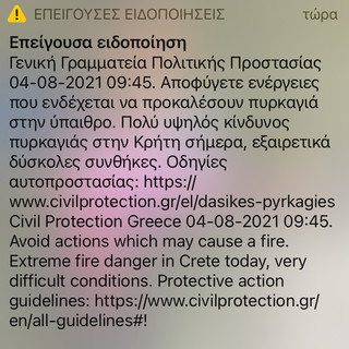 Μάλιστα, οι κάτοικοι της Ρόδου και της Κρήτης έλαβαν νωρίτερα μήνυμα από το 112, στο οποίο η Πολιτική Προστασία προειδοποιεί τον κόσμο να αποφύγει ενέργειες που ενδέχεται να προκαλέσουν πυρκαγιά στην ύπαιθρο.