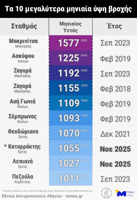 οι μηνιαίες τιμές βροχόπτωσης του Νοεμβρίου 2025 στον Καταρράκτη και στα Λεπιανά ‘Αρτας συγκαταλέγονται στα δέκα μεγαλύτερα μηνιαία ύψη βροχής που έχουν καταγραφεί από την έναρξη λειτουργίας του δικτύου αυτόματων μετεωρολογικών σταθμών του meteo.gr / Εθνικού Αστεροσκοπείου Αθηνών. «Τα δέκα μεγαλύτερα μηνιαία ύψη βροχής εμφανίζονται κυρίως σε τρεις περιόδους με έντονα καιρικά φαινόμενα: τον Φεβρουάριο 2019 (κακοκαιρίες Χιόνη και Ωκεανίς), τον Σεπτέμβριο 2023 (κακοκαιρίες Daniel και Ηλίας) και τον Νοέμβριο 2025 (κακοκαιρία Adel)», σημειώνει το meteo.gr/ ΕΑΑ.