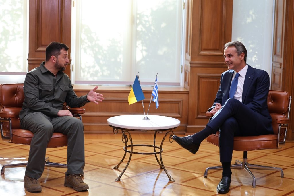 Ο Ουκρανός πρόεδρος αφίχθη κάτω από δρακόντεια μέτρα ασφαλείας, με τον πρωθυπουργό Κυριάκο Μητσοτάκη να τον υποδέχεται στην είσοδο.
