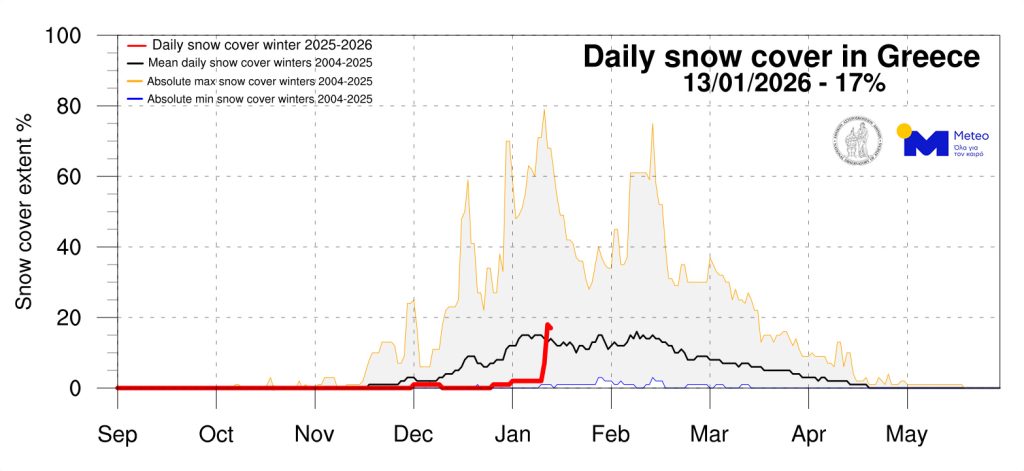 Η παρακολούθηση της χιονοκάλυψης από τον Σεπτέμβριο 2025 δείχνει ότι έως τα τέλη Δεκεμβρίου η παρουσία χιονιού στη χώρα ήταν αρκετά περιορισμένη, όπως συχνά συμβαίνει την τελευταία δεκαετία. Από τα τέλη Δεκεμβρίου παρατηρήθηκε σταδιακή αύξηση, ενώ απότομη ήταν η αύξηση της χιονοκάλυψης μετά τις 10 Ιανουαρίου, αποτέλεσμα ψυχρής εισβολής που επηρέασε με χιονοπτώσεις σημαντικό μέρος της επικράτειας.