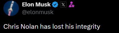 Απαντώντας στην ανάρτηση ο Έλον Μασκ έγραψε πως «Ο Κρις Νόλαν έχει χάσει την ακεραιότητά του».