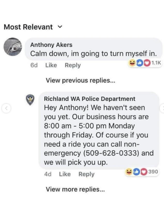 Ένας άνδρας από την πολιτεία της Ουάσινγκτον, που καταζητoύνταν από την αστυνομία επειδή παραβίασε την αναστολή του, συνομιλούσε με τους αστυνομικούς για σχεδόν μια εβδομάδα στην ενότητα σχολίων μιας ανάρτησης που είχαν κάνει στη σελίδα τους στο Facebook.
