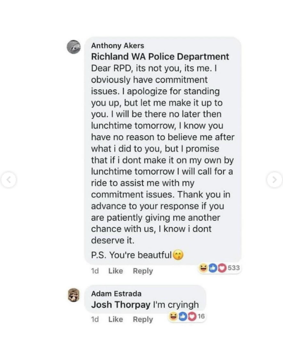Ευτυχώς για τους αστυνομικούς στο Ρίτσλαντ, ο Άκερς τελικά εμφανίστηκε στο τμήμα εκείνη την εβδομάδα, αλλά όχι πριν δημοσιεύσει μια σέλφι του έξω από το κτίριο, στην οποία έγραψε στη λεζάντα «Εδώ για το ραντεβού μας, γλυκιά μου». (ΕΔΩ)