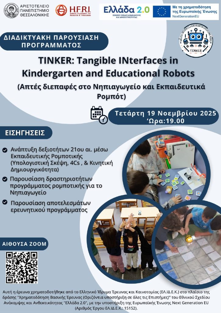 Τα παραπάνω συνέβησαν στο πλαίσιο του ερευνητικού προγράμματος, με τίτλο «Απτές διεπαφές στο Νηπιαγωγείο και Εκπαιδευτικά Ρομπότ» (TINKER: Tangible Interfaces in Kindergarten and Educational Robots), που αναπτύχθηκε στο Τμήμα Φιλοσοφίας και Παιδαγωγικής του Αριστοτελείου Πανεπιστημίου Θεσσαλονίκης, χρηματοδοτήθηκε από το ΕΛΙΔΕΚ και την Ευρωπαϊκή Ένωση, στο πλαίσιο της δράσης Βασικής Έρευνας, και υλοποιήθηκε πειραματικά σε δημόσια νηπιαγωγεία της Ροδόπης (2ο και 10ο Νηπιαγωγείο Κομοτηνής, 15ο Πειραματικό Νηπιαγωγείο Κομοτηνής), της Ανατολικής Θεσσαλονίκης (Νηπιαγωγείο Αγίας Παρασκευής), Χαλκιδικής (1ο και 4ο Νηπιαγωγείο Ν. Καλλικράτειας).